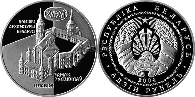 Baltarusijos istorija ir kultūra. Baltarusijos architektūros paminklai. Moneta skirta Radvilų rūmams, Nesvyžius.