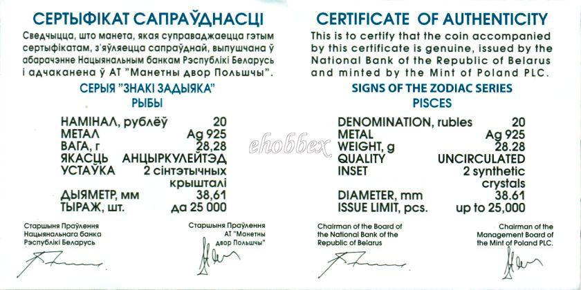 Baltarusija ir pasaulio bendruomenė. Žuvys. Zodiako ženklų serija. Monetos paviršius oksiduotas.