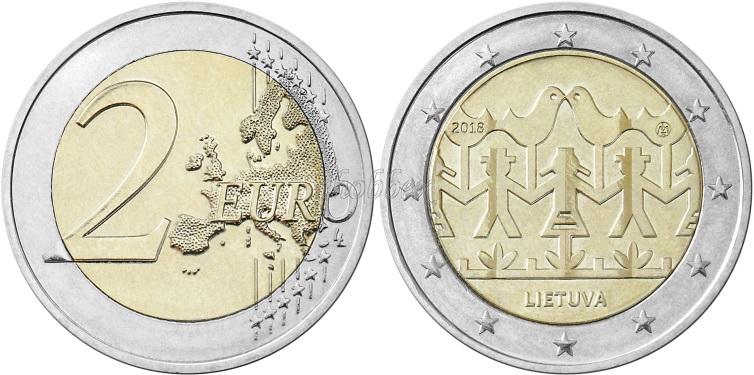Monetos nacionalinėje pusėje pavaizduotos lietuvių liaudies šokį ir dainą simbolizuojančios stilizuotos žmonių ir paukščių figūros, būdingos vienam iš lietuvių tautodailės žanrų – karpiniams. Užrašas LIETUVA, išleidimo metai 2018, taip pat gamintojo UAB „Lietuvos monetų kalykla“ logotipas, apskritimu išdėstyta 12 ES žvaigždžių.