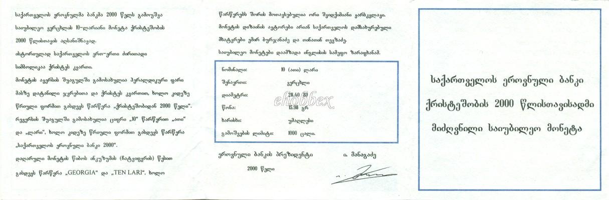 Užrašai anglų kalba "GEORGIA" ir "TEN LARI" su dviem žvaigždutėmis tarp jų