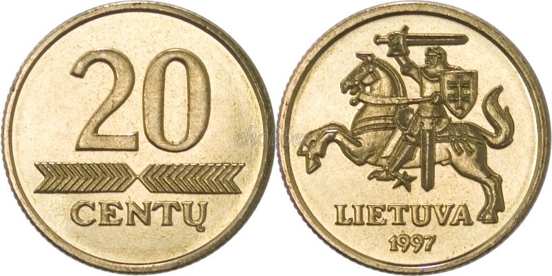 Viršutinėje dalyje - skaitmuo 20, po juo „eglutės“ motyvo horizontalus ornamentas, dar žemiau - užrašas CENTŲ. Monetos kraštą juosia apvadas, kurio vidinė pusė lygi.