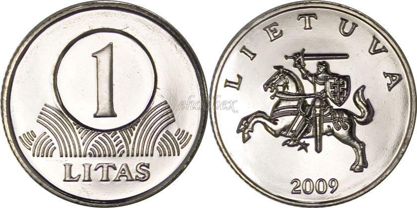 В верхней половине монеты углубленный в поле монеты круг, в нем цифра 1 номинала, под кругом национальный орнамент, внизу надпись LITAS (ЛИТ).
