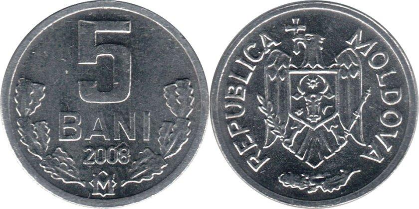 центре номинальная стоимость "5 BANI"; год выпуска 2008; в нижней части буква "M" (Moldova), которая расположена на квадрате.