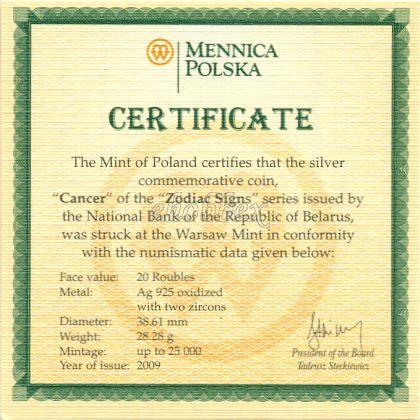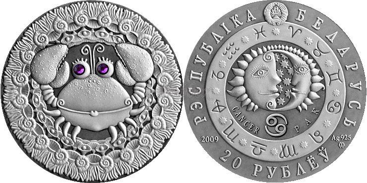 в центре в обрамлении круга, состоящего из 12 символов Знаков зодиака, изображение солнца и луны, под ними – астрологический знак Рак и надписи: на латинском –"CANCER", на белорусском языке – "РАК"; в верхней части – рельефное изображение Государственного герба Республики Беларусь; в нижней части слева указан год чеканки (на серебряной справа – проба сплава и фирменный (товарный) знак Монетного двора Польши); по кругу надпись: "РЭСПУБЛІКА БЕЛАРУСЬ"; в нижней – "20 РУБЛЁЎ" (на серебряной) и "1 РУБЕЛЬ" (на медно–никелевой).