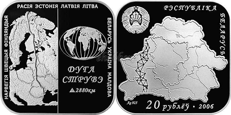 На оборотной стороне монет расположены: слева – рельефное изображение карты Европы, по которой проходит Дуга Струве, справа –изображение карты мира, под ним надписи: ДУГА СТРУВЭ и её протяженность – 2880 км, по периметру монеты даны названия стран, через которые проходит Дуга Струве: НАРВЕГІЯ ШВЕЦЫЯ ФІНЛЯНДЫЯ РАСІЯ ЭСТОНІЯ ЛАТВІЯ ЛІТВА БЕЛАРУСЬ УКРАІНА МАЛДОВА.