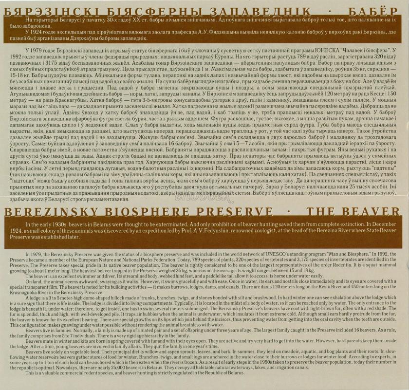 в центре – изображение семьи бобров на фоне стилизованного водоема; по кругу надписи: слева вверху – "БЯРЭЗІНСКІ БІЯСФЕРНЫ ЗАПАВЕДНІК", внизу – "БАБЁР".