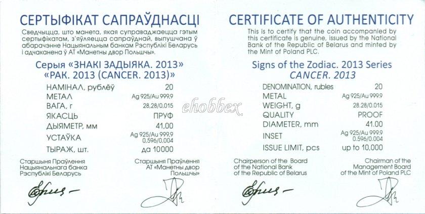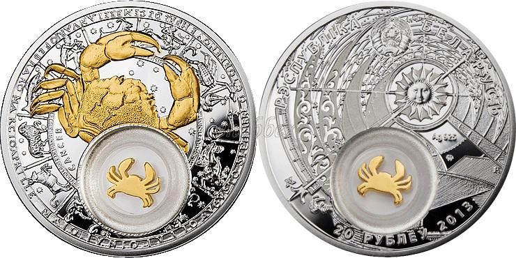 вверху − рельефное изображение Государственного герба Республики Беларусь; в центре монеты – изображение фрагмента гравюры из работы "Ars Magna Lucis et Umbrae" немецкого ученого А. Кирхера, представляющей взаимодействие небесных тел; справа – проба сплава, под ней – фирменный (товарный) знак АО "Монетный двор Польши"; по кругу надписи: вверху – РЭСПУБЛIКА БЕЛАРУСЬ, внизу – номинал 20 РУБЛЁЎ и год чеканки.