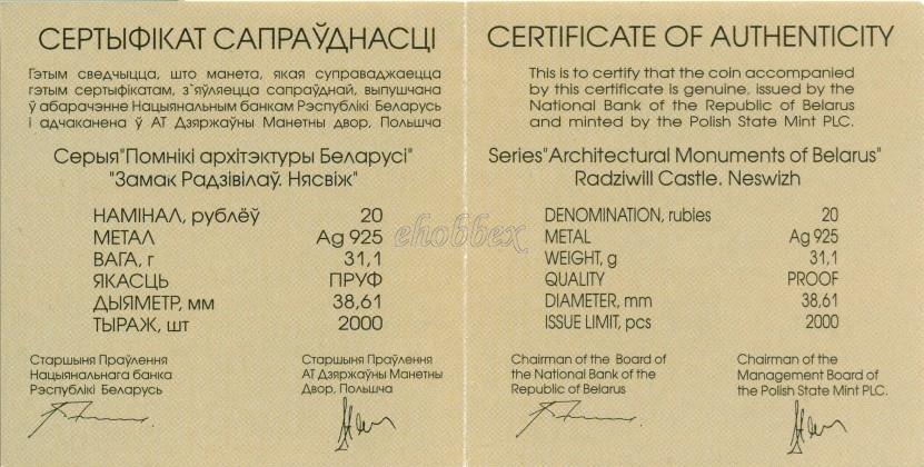 в круге, обрамленном геометрическим орнаментом, – рельефное изображение Государственного герба Республики Беларусь, под ним указаны год чеканки, для серебряной – проба сплава; по кругу – надписи: в верхней части – "РЭСПУБЛIКА БЕЛАРУСЬ", в нижней – "ДВАЦЦАЦЬ РУБЛЁЎ" на серебряной и "АД3IН РУБЕЛЬ" – на медно–никелевой.