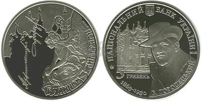 На аверсе монеты вверху размещен малый Государственный Герб Украины, надпись полукругом НАЦИОНАЛЬНЫЙ БАНК УКРАИНЫ, под которым (справа) год чеканки монеты - 2013, на фоне дома с химерами изображен портрет с надписью полукругом В. ГОРОДЕЦКИЙ, слева от которого - годы жизни архитектора 1863 - 1930, над которыми номинал - 5 ГРИВЕН и логотип Монетного двора Национального банка Украины.