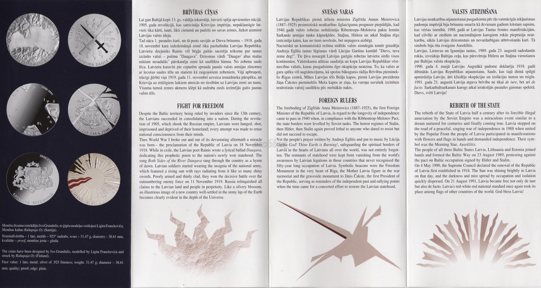 На оборотной стороне монеты в центре изображены контуры Латвии, над которыми полукругом расположены три звезды и дата — 18 ноября 1918 года.