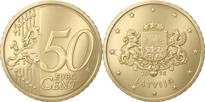 Справа цифра 50 номинала, под ней надпись в две строки EURO CENT (ЕВРО ЦЕНТ), справа от цифры по центру знак дизайнера LL (подпись - две перекрещивающиеся буквы L, напоминающие цифру 4). Слева шесть вертикальных параллельных линий – символ стабильности, перекрывающихся картой Европы (дизайн реверса 10, 20 и 50 центовых монет символизирует объединение государств-членов Евросоюза, члены Евросоюза, не входящие в Еврозону также изображены). На концах линий 12 звезд.