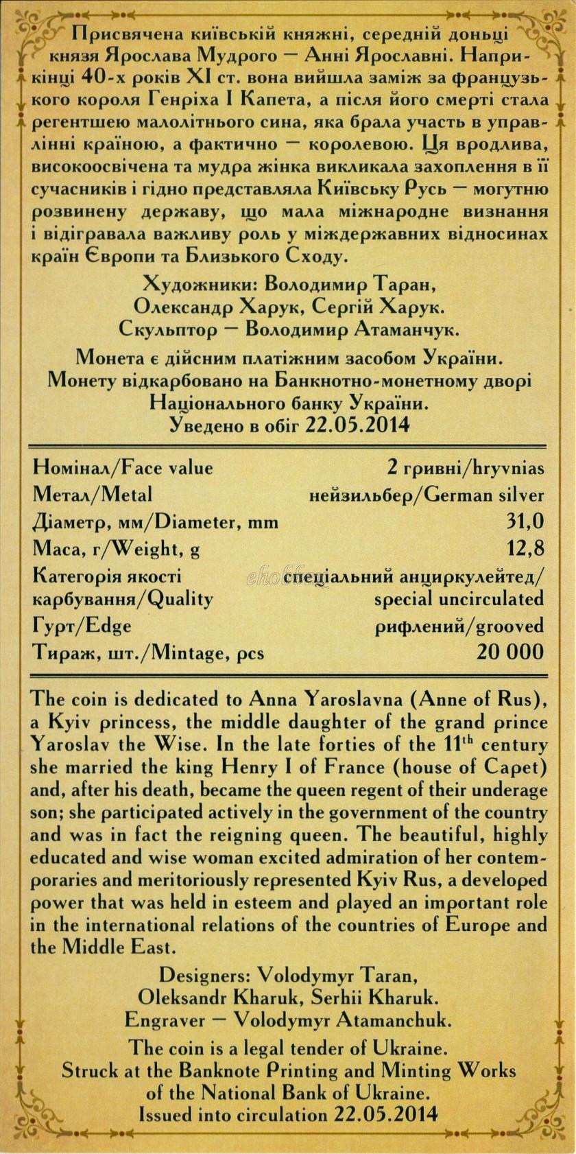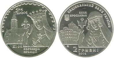 Новая монета посвящена дочери киевского князя Ярослава Мудрого - Анне Ярославне. В конце 40-х годов XI в . она вышла замуж за французского короля Генриха I, после смерти которого стала регентшей их малолетнего сына.