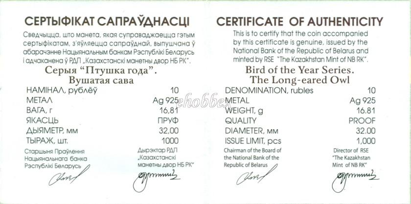 вверху – рельефное изображение Государственного герба Республики Беларусь, по кругу надпись: РЭСПУБЛІКА БЕЛАРУСЬ; в центре, в овале – изображение птенца на стилизованных ладонях, под ним справа – год чеканки (на серебряной монете – проба сплава); внизу – номинал: 10 РУБЛЁЎ.