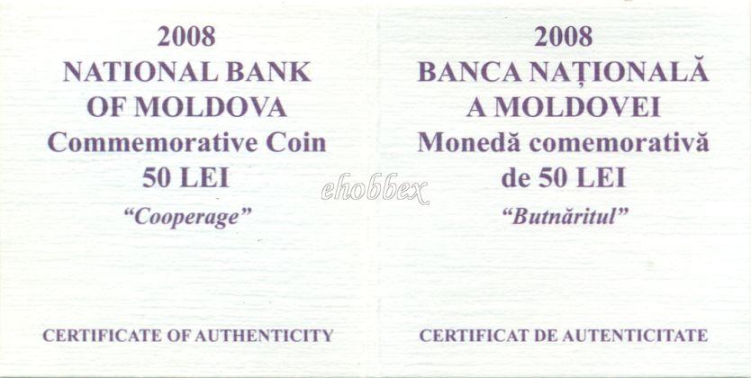 в центре - герб Республики Молдова; в верхней части - цифра "2008"; в нижней части – надпись "50 LEI"; по окружности монеты - заглавными буквами выгравирована надпись „REPUBLICA MOLDOVA”.