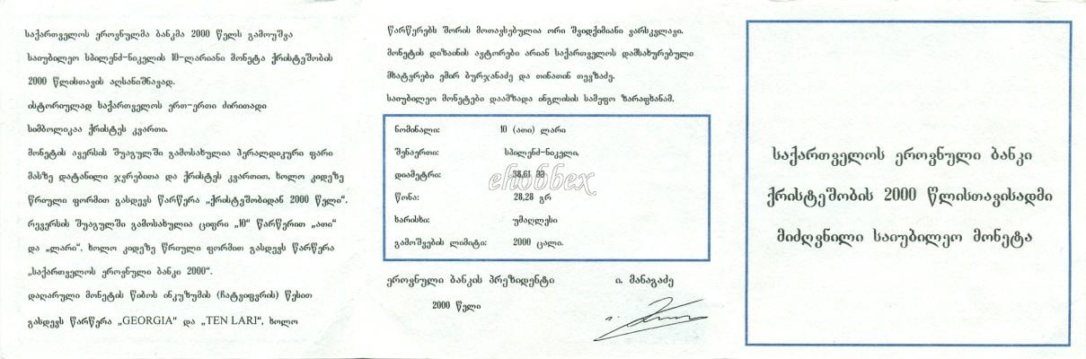 В центре — цифра «10», под ней надпись — «десять лари», по окружности текст на грузинском языке «Национальный банк Грузии 2000».