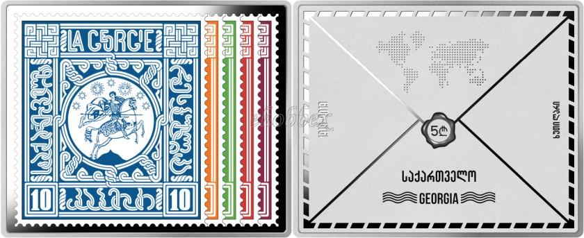 На реверсе, с помощью лазерной гравировки нанесён рисунок, напоминающий обратную сторону запечатанного письма под пломбой, над которой расположена схематическая карта Мира. В центре аверса, на пломбе изображена номинальная стоимость - «5» и графический знак грузинского лари. В нижней части надписи на английском и грузинском языках: название страны эмитента - «საქართველო / GEORGIE». В левой части две юбилейные даты - «1919 - 2019», в правой части номинальная стоимость монеты прописью - «ხუთი ლარი» (пять лари).