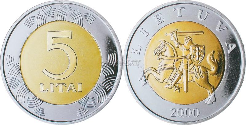 Номинал в две строки (литовский) 5 LITAI (5 ЛИТОВ). На внешнем кольце по окружности национальный орнамент.