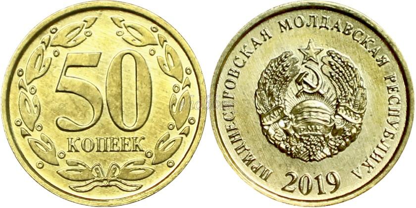 в центре расположен государственный герб ПМР, обрамленный по кругу надписью "Приднестровская Молдавская Республика". Под гербом расположен год образца "2019".