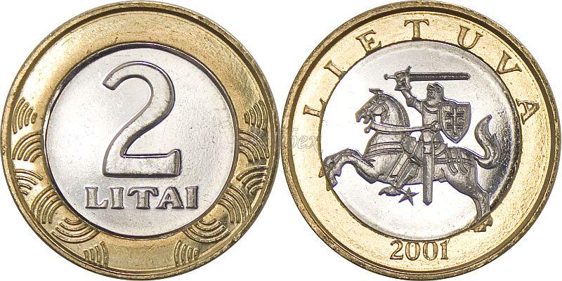 Номинал в две строки (литовский) 2 LITAI (2 ЛИТА). На внешнем кольце в нижней половине полукругом национальный орнамент.