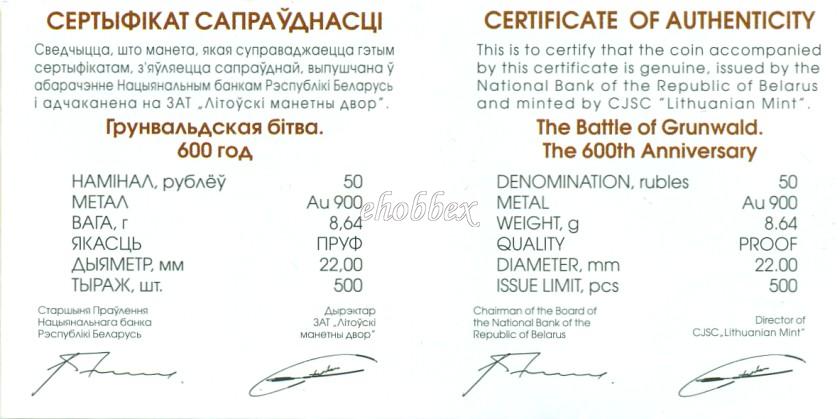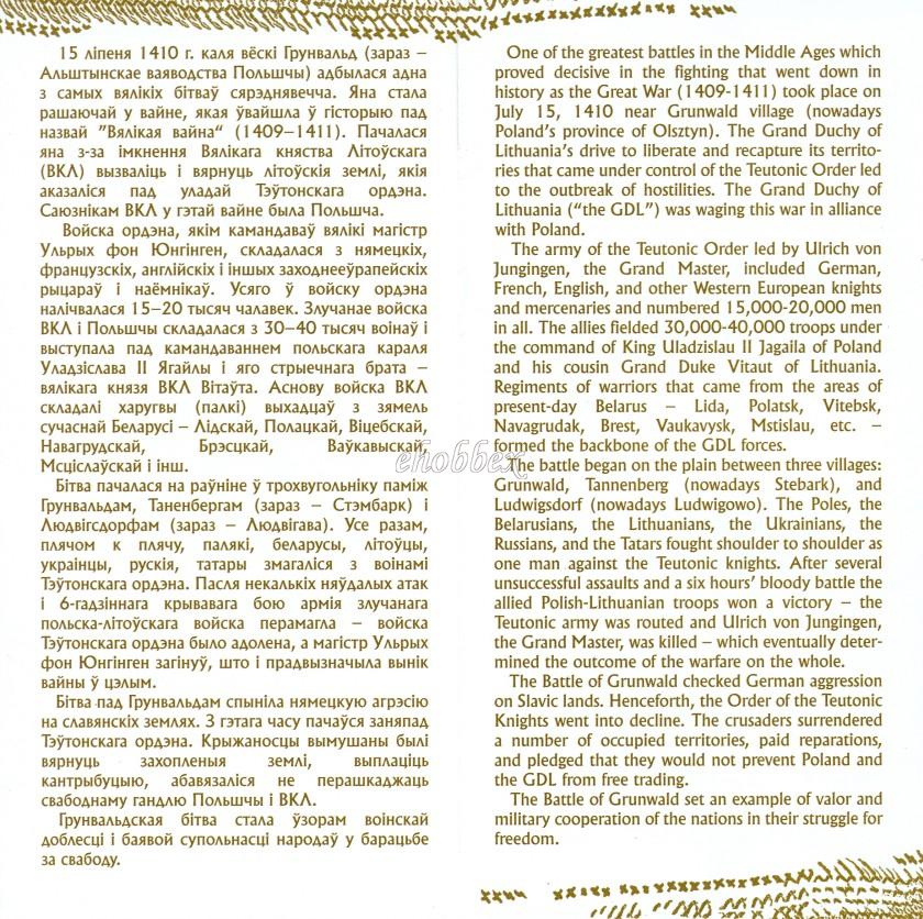 На лицевой стороне золотой монеты номиналом 50 рублей, серебряной и медно–никелевой монет расположены: вверху – рельефное изображение Государственного герба Республики Беларусь; в центре – стилизованное изображение меча, по очертанию напоминающее человека: на золотой монете – на фоне потрескавшейся земли, на серебряной и медно–никелевой монете – на фоне кольчуги; по кругу надписи: в верхней части – РЭСПУБЛІКА БЕЛАРУСЬ, в нижней – 50 РУБЛЁЎ (на золотой монете), 20 РУБЛЁЎ (на серебряной) и 1 РУБЕЛЬ (на медно–никелевой), проба сплава (на золотой и серебряной) и год выпуска монет в обращение.
